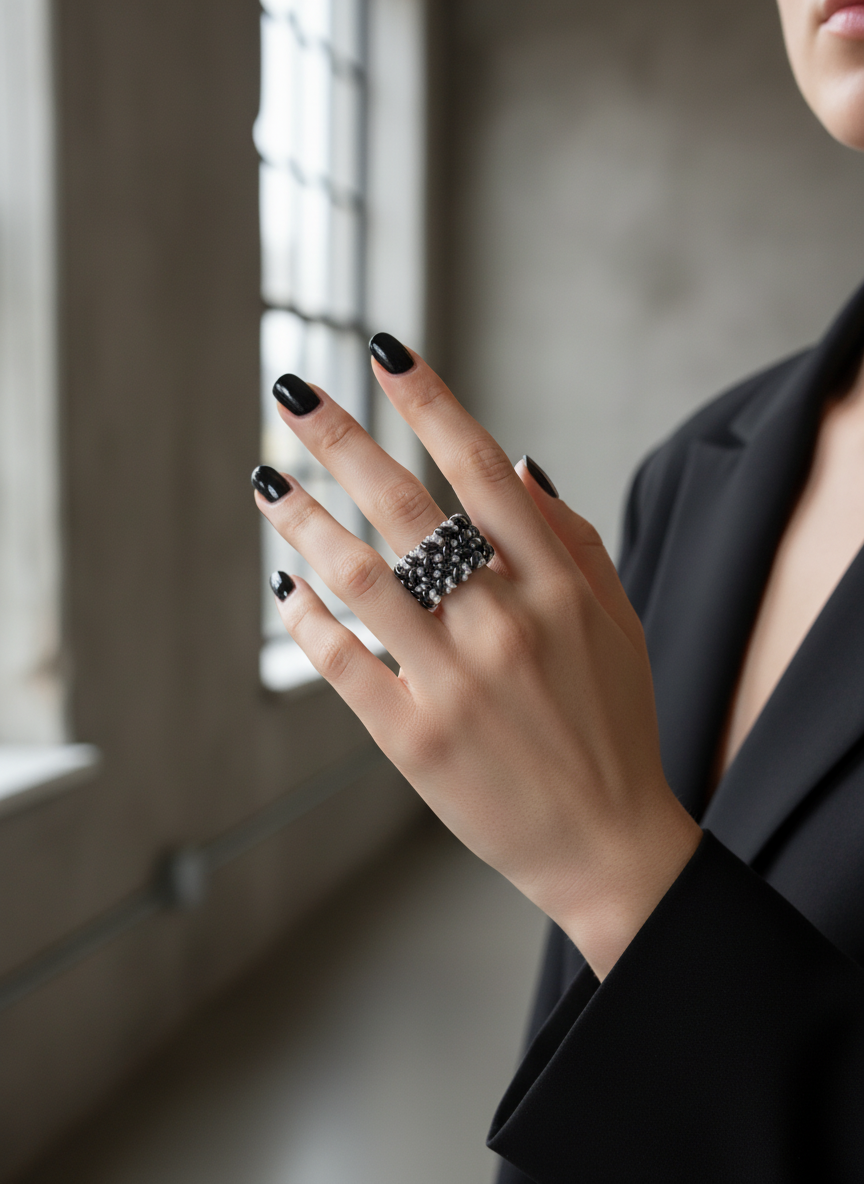 Make a striking statement with this handcrafted black beaded ring designed for those who love bold, distinctive style. The wide, chunky band is created from glossy black glass beads woven in a textured pattern that catches the light beautifully. Its substantial size gives it a modern, edgy look, while the beadwork adds a touch of artisanal charm. Whether worn as a standalone piece or paired with other rings, this design is versatile enough for both casual outfits and evening wear.