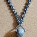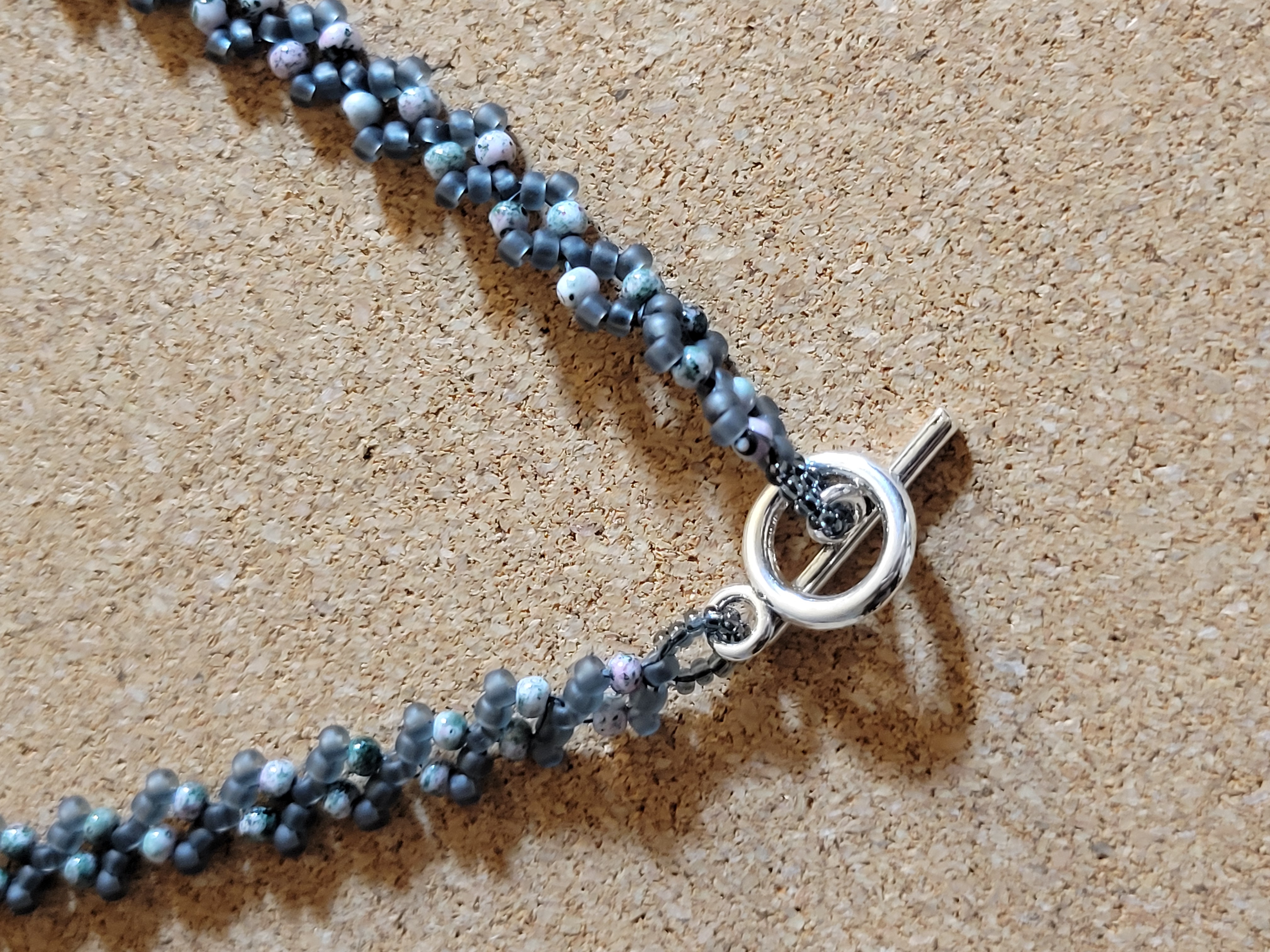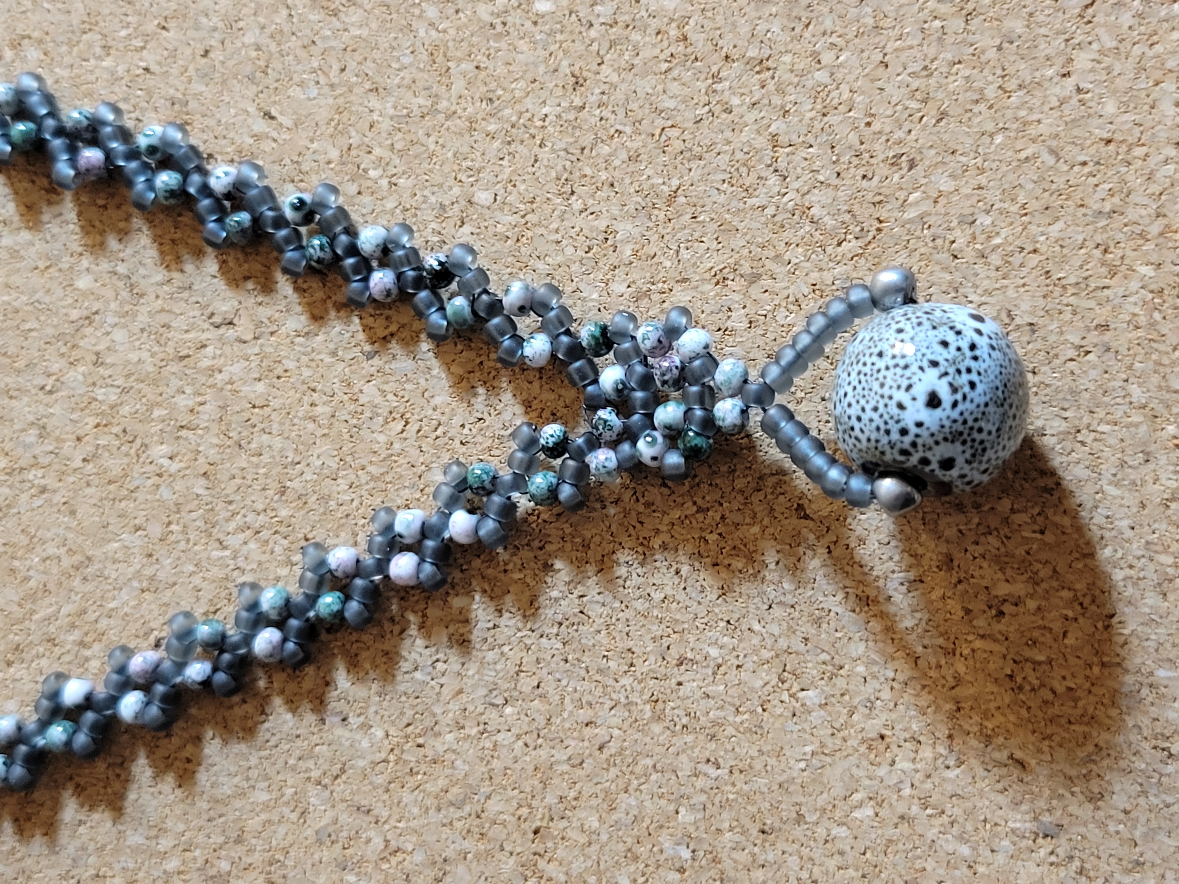Soft blue gray and pale metallic beads are woven into a gentle spiral that draws the eye toward a textured glass pendant with a delicate, almost lunar surface.