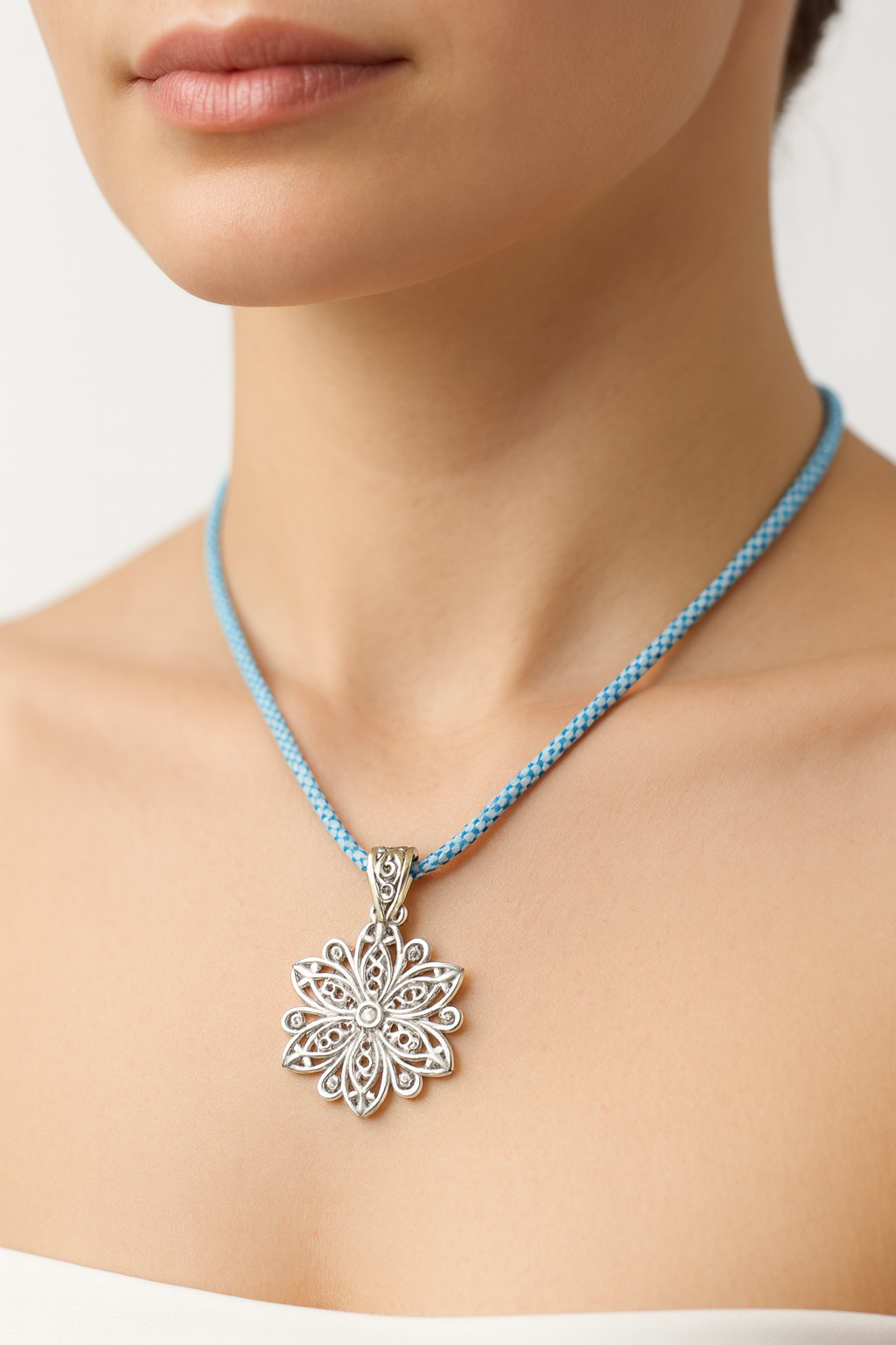 Bring a touch of nature’s calm beauty to your style with this handmade necklace which features a detailed silver-tone filigree pendant in a star-like floral design, paired with a handwoven blue beaded cord that reflects the fresh colors of open skies and wild meadows. Lightweight and versatile, this necklace can dress up a casual outfit or add a nature-inspired accent to evening wear. It’s the perfect gift for anyone who loves artisan jewelry with a timeless yet earthy feel.