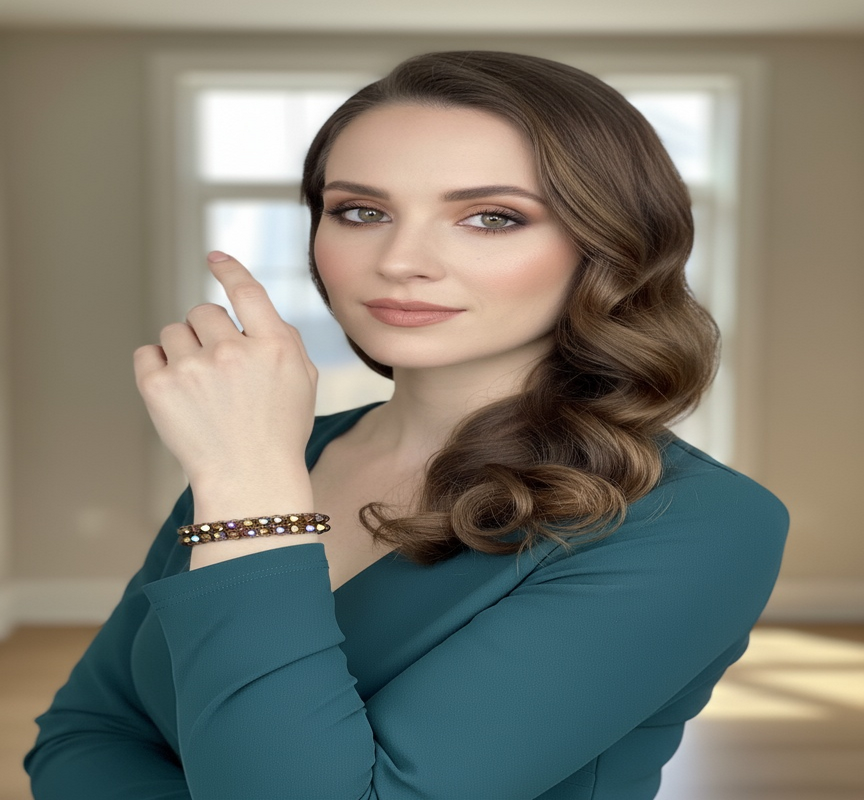 The Cinnamon Stick Beaded Bracelet glows with the rich warmth of spiced bronze tones and a hint of shimmer. Faceted crystal beads reflect the light beautifully, shifting from deep amber to golden highlights with every movement.