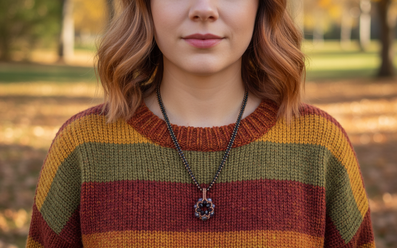 Handwoven from shimmering bronze, copper, and black glass beads, this geometric pendant catches the light with every movement. The petal-like form adds softness to its structured design, creating a statement piece that’s both grounded and radiant.