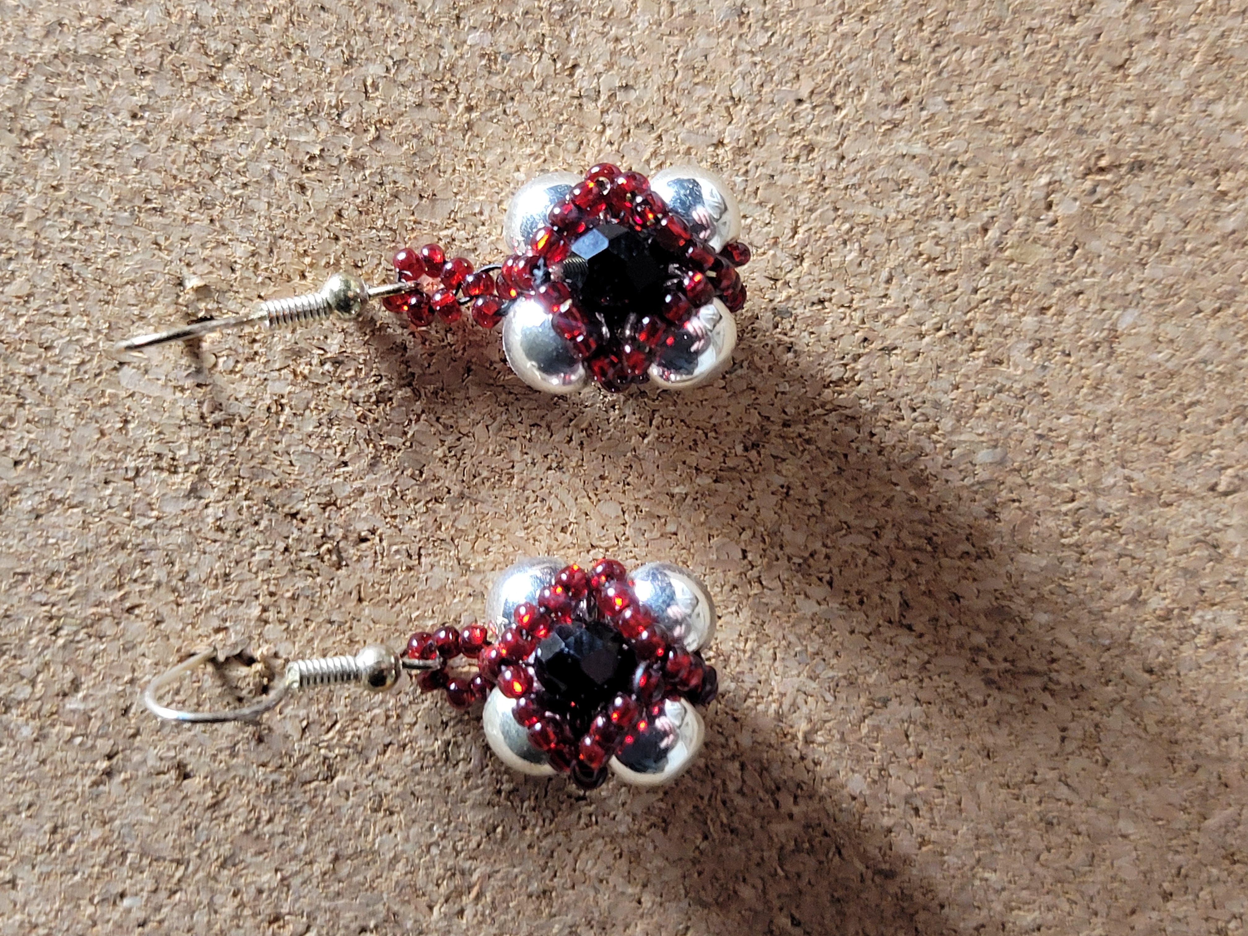 Small but mighty, these bold beaded earrings command attention. Each earring features a black faceted center crystal framed in deep crimson seed beads, surrounded by gleaming silver rounds for a structured yet dimensional look. The intricate beaded bail adds detail without adding weight, making them perfect for both everyday edge and evening drama. These simple earrings are for anyone who loves a bit of glam or just appreciates finely detailed handmade jewelry.