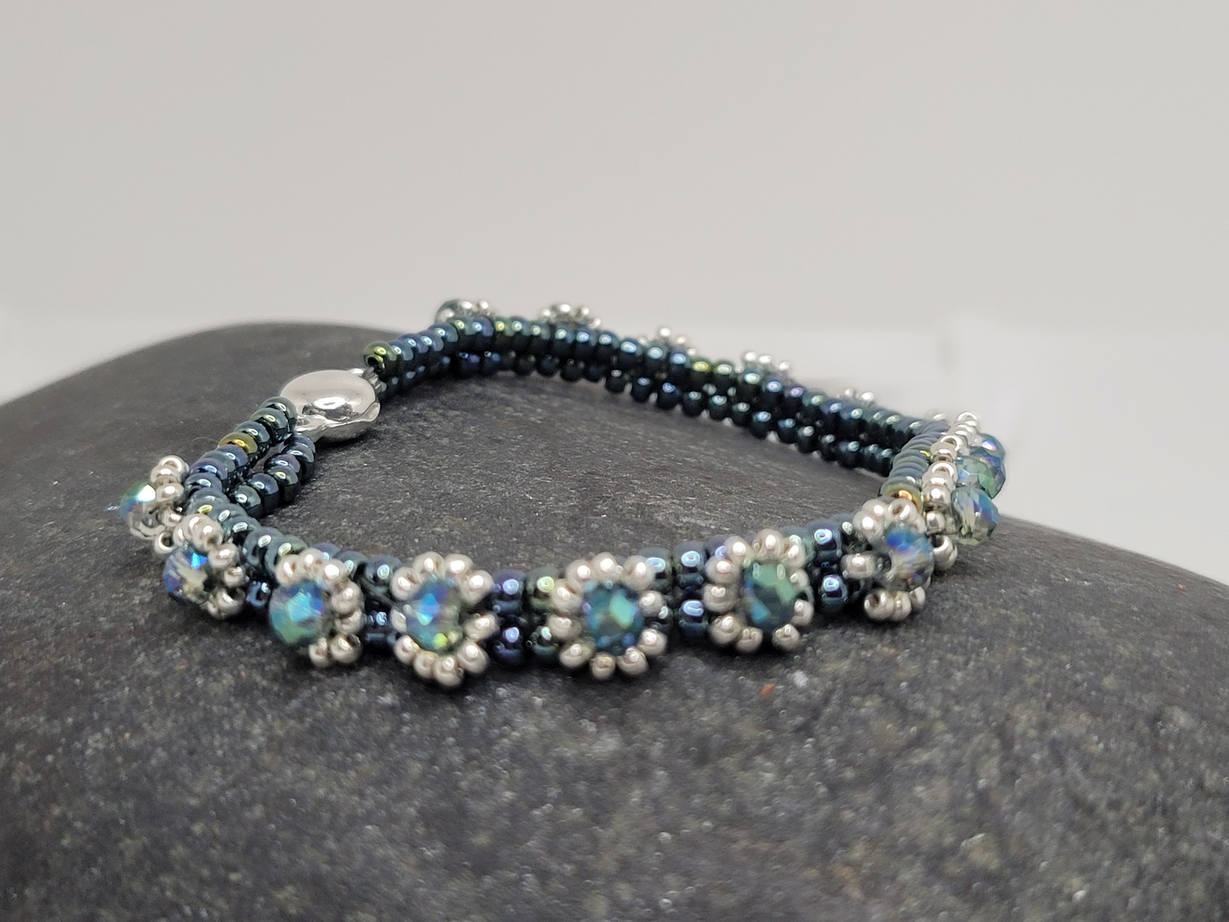 Midnight Tides is a coordinated bracelet and earrings set built around deep blue and steel-toned seed beads, accented with shimmering blue crystal details that catch the light without overpowering the design.