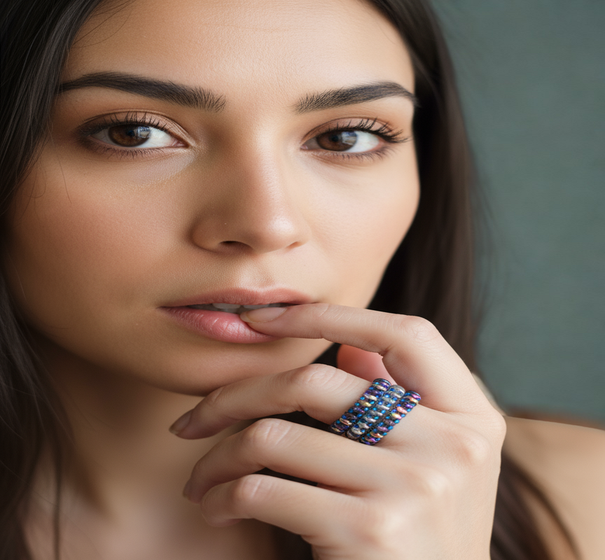 This set of three stackable beaded rings brings together nature-inspired colors with a hint of shimmer, making them perfect for everyday wear or a subtle statement. Each ring is handwoven with durable beading thread and iridescent Czech glass beads that shift between tones of blue, green, and purple depending on the light. Wear them together for a bold layered look, or mix and match for a softer, minimal style. These rings are flexible, comfortable, and lightweight — a great choice for anyone who loves jewelry that feels as effortless as it looks.