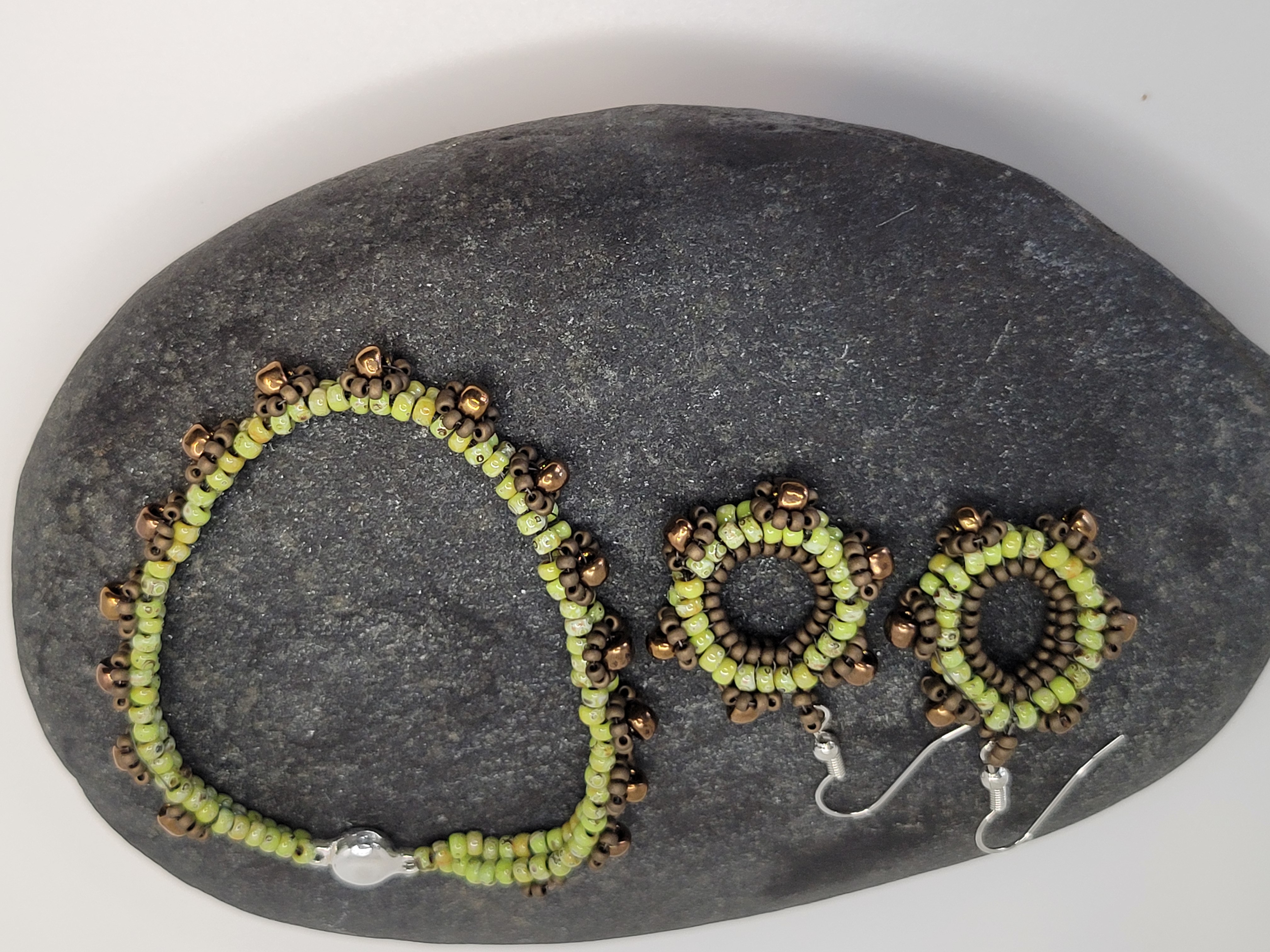 Each piece is handwoven bead by bead, forming repeating floral-inspired motifs that give the set texture and rhythm. The bracelet wraps comfortably around the wrist, while the earrings add just enough movement and depth to elevate everyday outfits or complement more intentional styling.