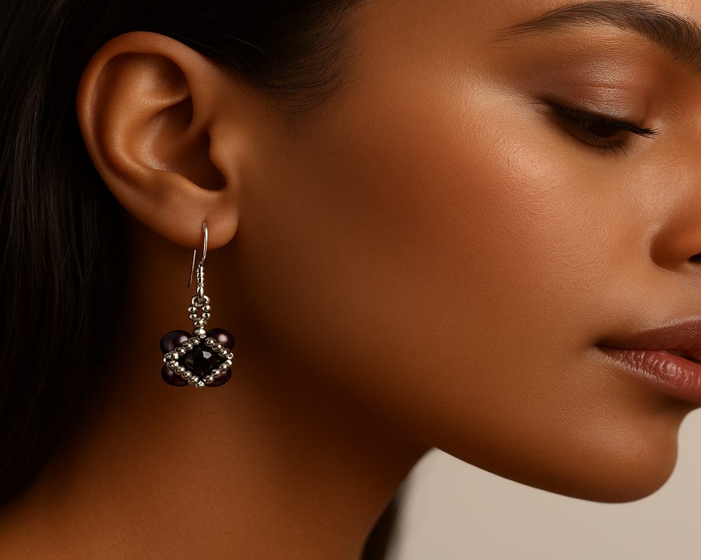 Elevate your style with these elegant handmade earrings, featuring deep plum glass pearls paired with faceted jet-black crystals. Each crystal is framed with delicate silver seed beads, adding a polished shimmer that catches the light beautifully. The intricate beadwork creates a refined yet versatile design, perfect for both everyday wear and special occasions. These earrings are lightweight and comfortable, making them an ideal choice whether you’re dressing up for an evening out or adding a touch of sophistication to your daily look.