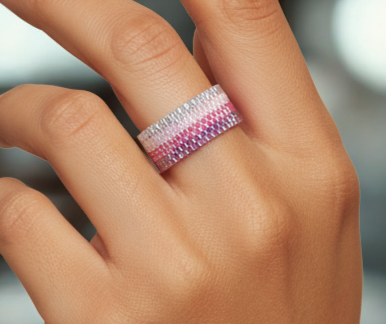 Woven with tiny glass beads in a delicate pink ombré, this slim handmade ring is soft, flexible, and eye-catching. Subtle enough for daily wear but never boring.