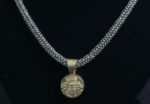 Bees symbolize strength, leadership, and harmony. Whether you’re the queen of your own hive or gifting someone who keeps things buzzing, this necklace is a reminder of inner power wrapped in artisan elegance. A bold tribute to resilience, community, and the beauty of nature, this necklace features a tightly woven beaded rope in smoky gray glass, crowned with an antique silver-tone bee medallion that evokes vintage coin charm and quiet authority.