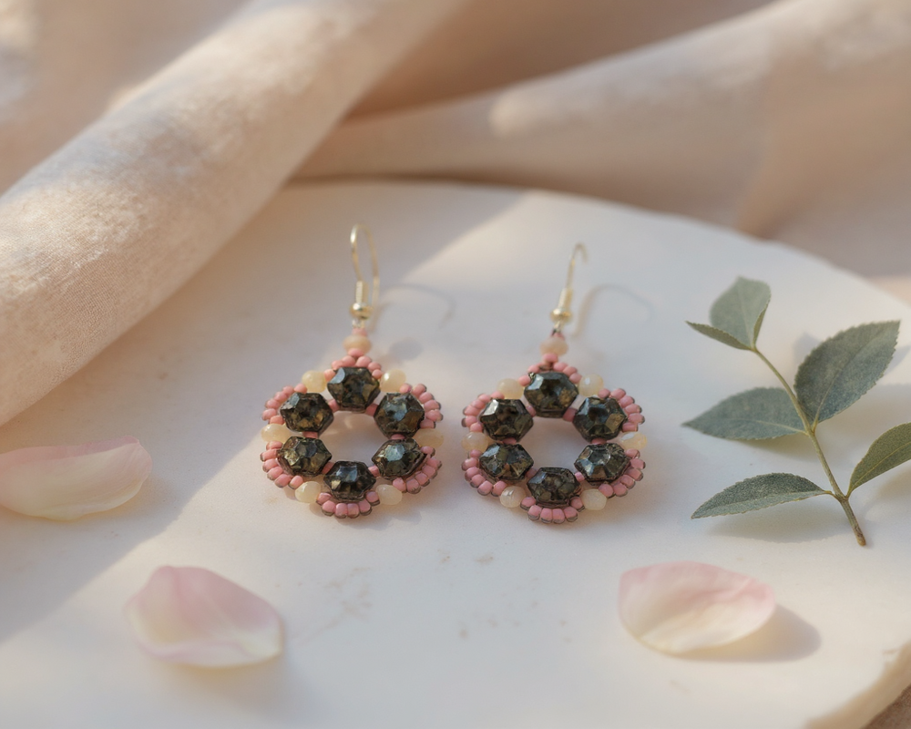 Soft romance meets handmade artistry in these Rosy Twilight Charm Earrings. Each earring is crafted from faceted dark glass beads framed with blush pink and creamy seed beads, forming a delicate circular charm that hangs from classic earring hooks. The color pairing gives a gentle yet striking contrast—like the last glow of a sunset fading into evening. Lightweight and comfortable, these earrings add a touch of handmade elegance to everyday outfits while still being dressy enough for evenings out. Whether you’re looking for a unique gift or a versatile pair for your own jewelry box, these are sure to become a favorite.
