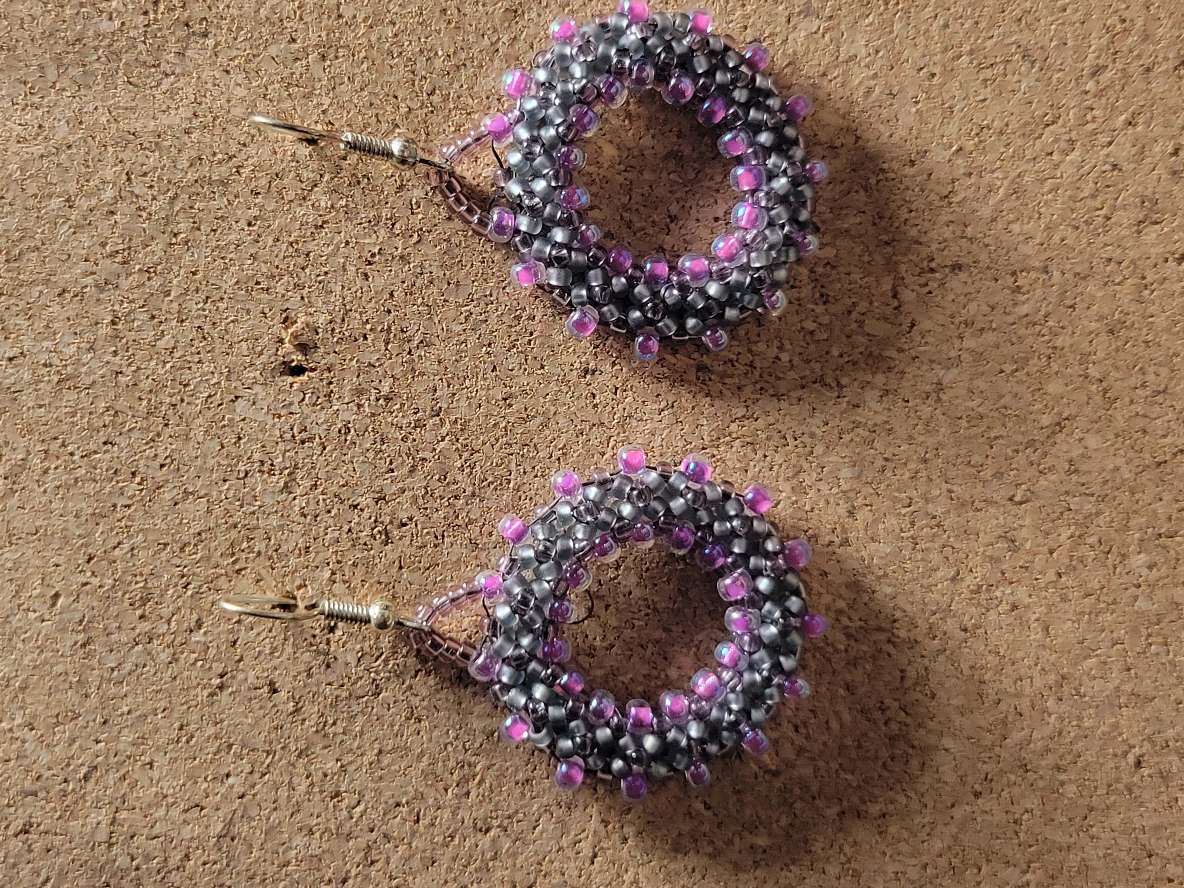 Striking and elegant, these handwoven hoop earrings bring an edgy twist to everyday glam. Metallic gray seed beads spiral around shimmering purple glass beads, forming a bold circular design that’s both lightweight and eye-catching. Whether you're heading out in denim or dressing up for a night out, these earrings give just the right amount of sparkle with artisan charm.