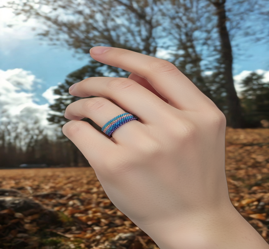 A little slice of sunset for your hand.This slim peyote-stitched beaded ring blends glowing purples, golden orange, and shimmery blues in a neat striped layout that feels like a slow summer sunset. It’s light, flexible, and made to wear every day — whether you're chasing warm weather or just want to bring the vibe with you.