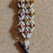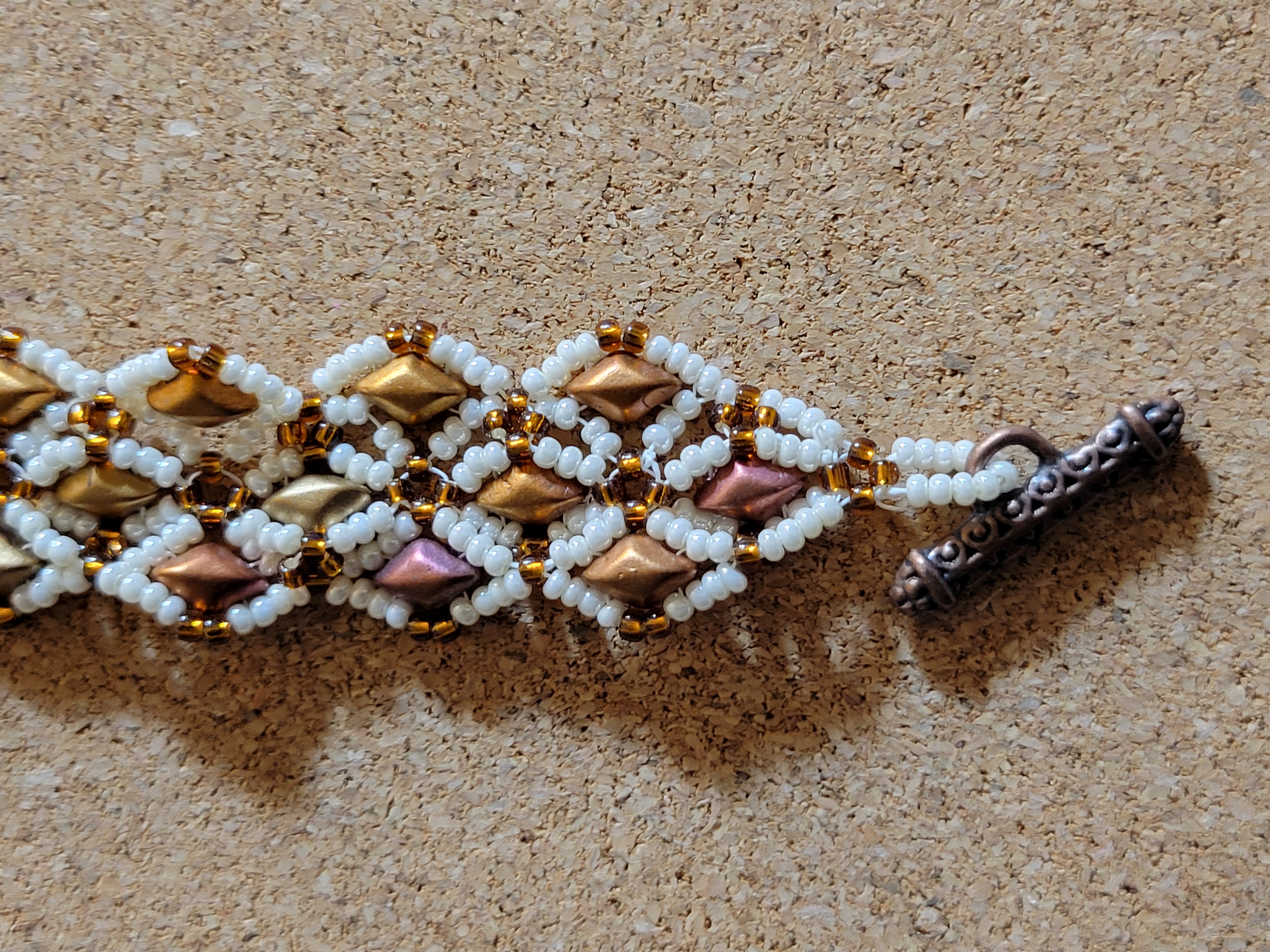 This luminous, handwoven bracelet radiates warmth and rustic elegance. Inspired by sunlit canyons and desert sand, this piece features a repeating diamond pattern in amber, rose, and butterscotch. The soft cream seed bead background adds a subtle glow, while bronze and copper accents give it earthy richness. Finished with a beautifully patterned antiqued copper toggle clasp, this bracelet measures about 8.5 inches from end to end and brings a touch of light and artisan craftsmanship to your wrist — perfect for both casual wear and elegant layering.