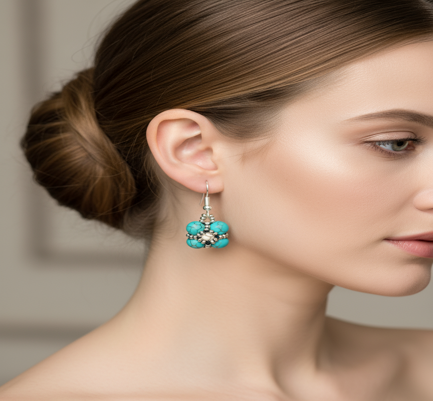 Add a touch of bold elegance to your look with these handcrafted earrings which feature a cluster of turquoise-colored beads accented by shimmering metallic seed beads. The unique beaded charm dangles gracefully from classic ear hooks, creating movement and catching the light with every turn of your head. Perfect for dressing up a simple outfit or adding a playful pop of color to your evening look, these earrings blend artisanal craftsmanship with modern style.
