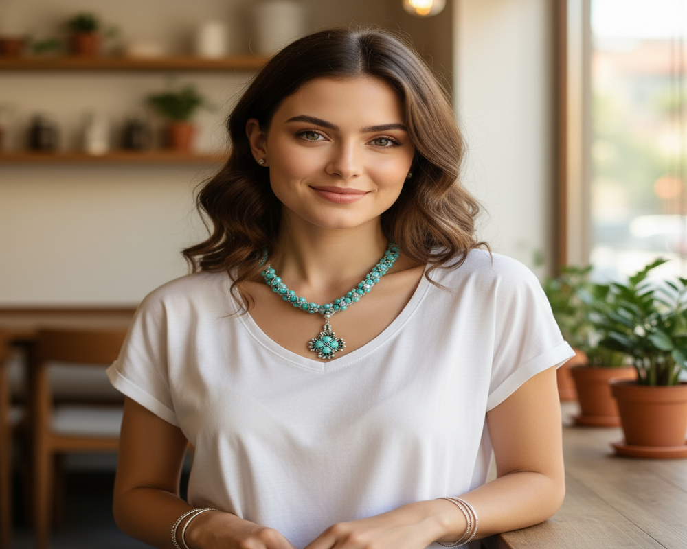 This elegant handmade beaded choker features rich turquoise stones intricately woven with sparkling crystal seed beads. The centerpiece pendant echoes a floral motif, bringing a bold, bohemian flair to this unique statement necklace. Ideal for special occasions, gifting, or everyday confidence.