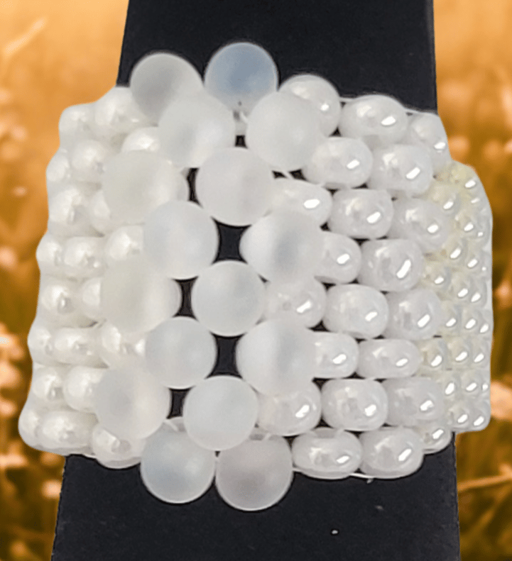 Elegant in creamy pearl tones, this handmade seed bead ring brings texture and a hint of shine to your look. Lightweight but eye-catching — it's a toast to quiet glam.