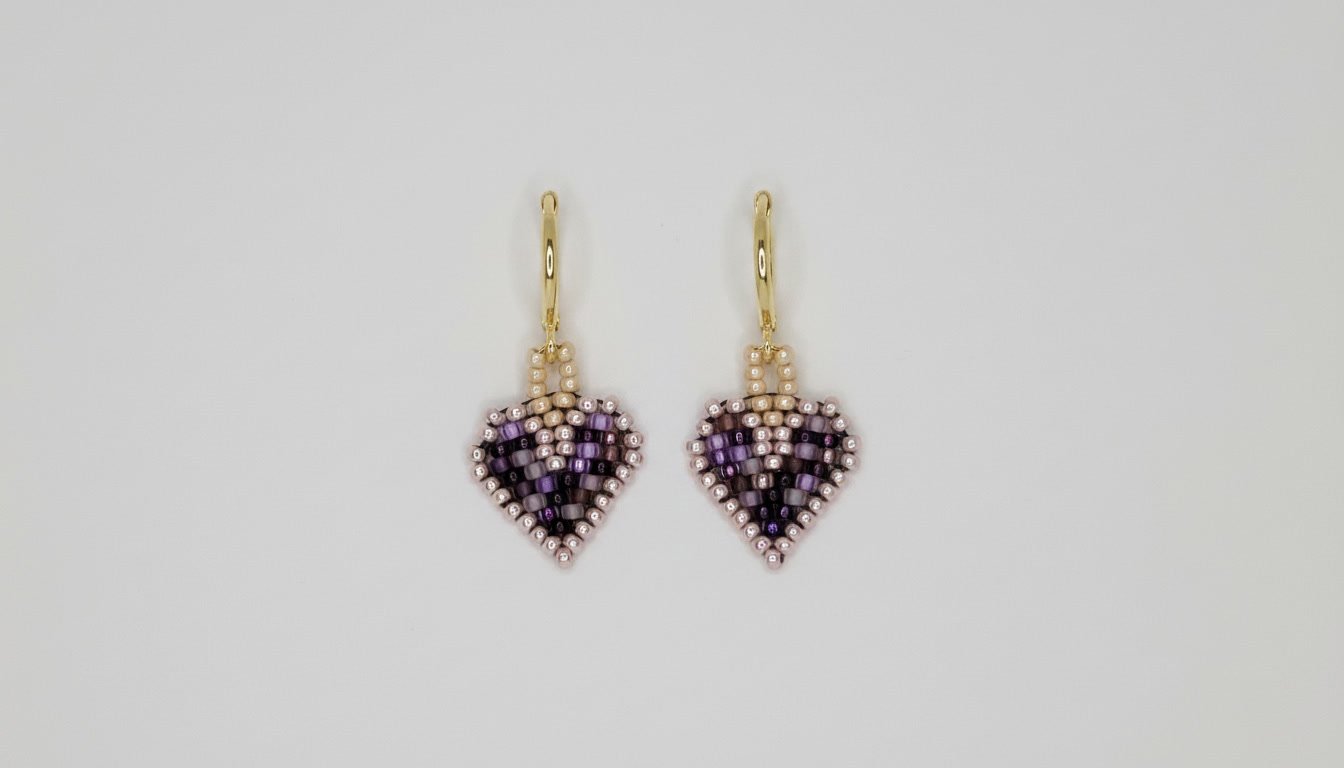 The center of each woven heart is layered with deep plum and violet tones, giving the shape a darker, more velvety feel. A soft blush and pearl-toned edge frames the silhouette, keeping the design balanced and defined.