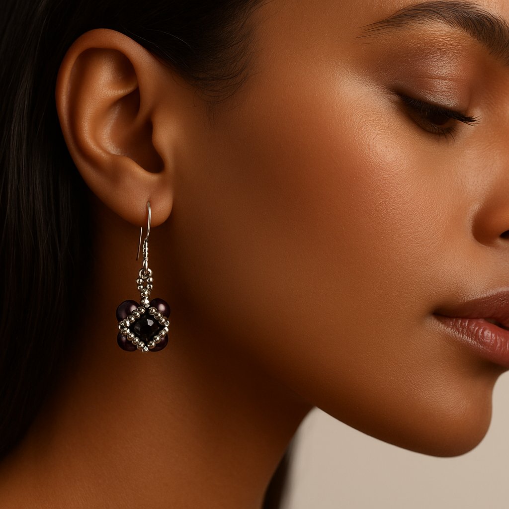 Elevate your style with these elegant handmade earrings, featuring deep plum glass pearls paired with faceted jet-black crystals. Each crystal is framed with delicate silver seed beads, adding a polished shimmer that catches the light beautifully. The intricate beadwork creates a refined yet versatile design, perfect for both everyday wear and special occasions.