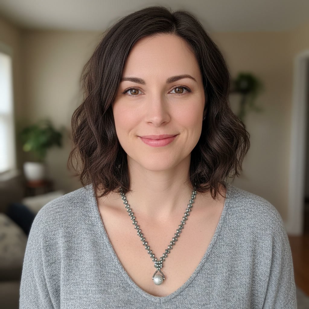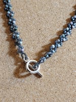 The Blue Gray Planet necklace is a subtle statement piece designed for effortless wear. Soft blue gray and pale metallic beads are woven into a gentle spiral that draws the eye toward a textured glass pendant with a delicate, almost lunar