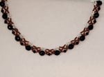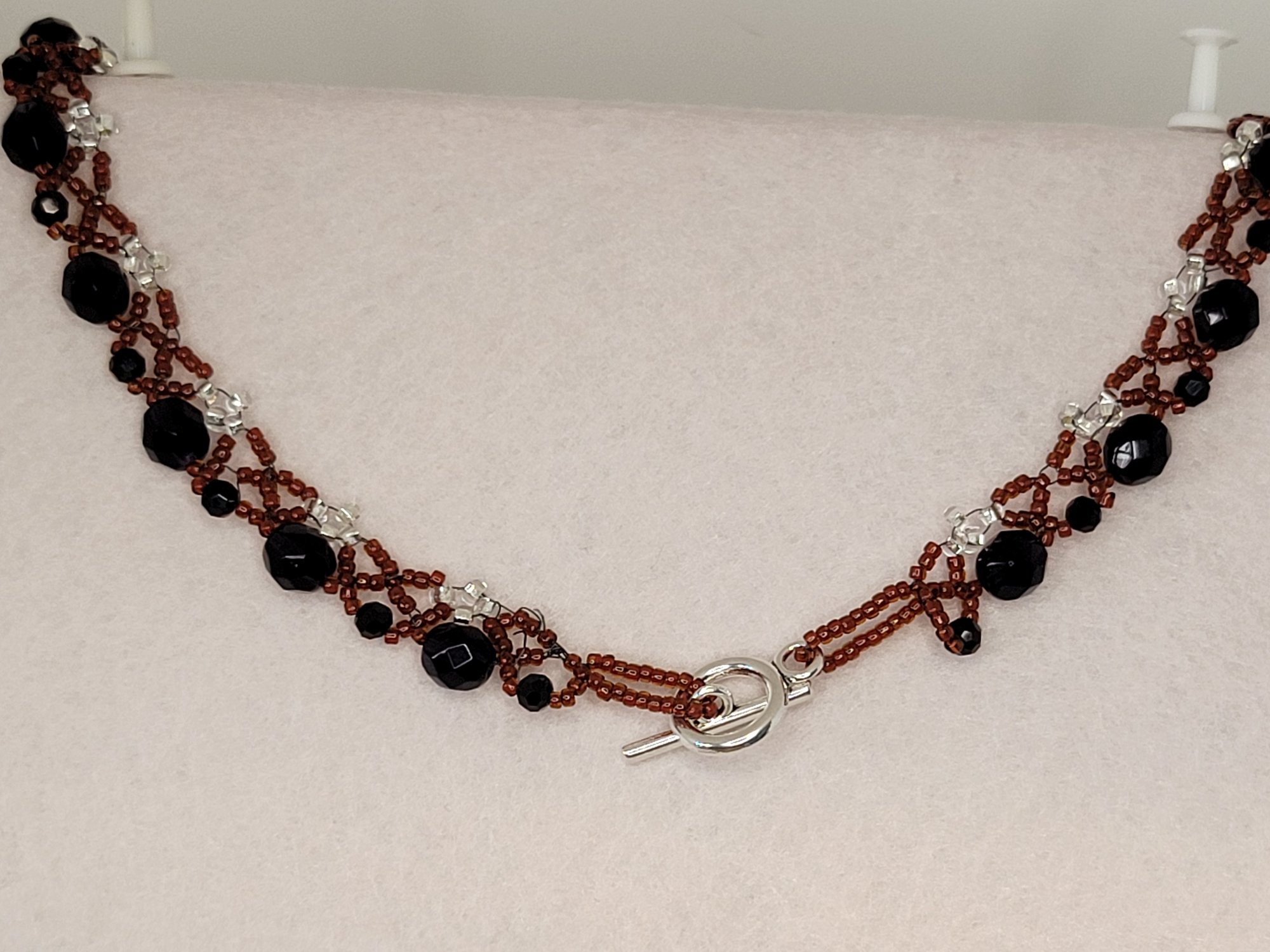 Fire & Ice is a handmade beaded necklace built around contrast. Deep cranberry seed beads form the foundation of the design, bringing warmth and richness, while black accents add depth and structure. Clear crystal details catch the light and introduce a cool, reflective element that balances the darker tones.